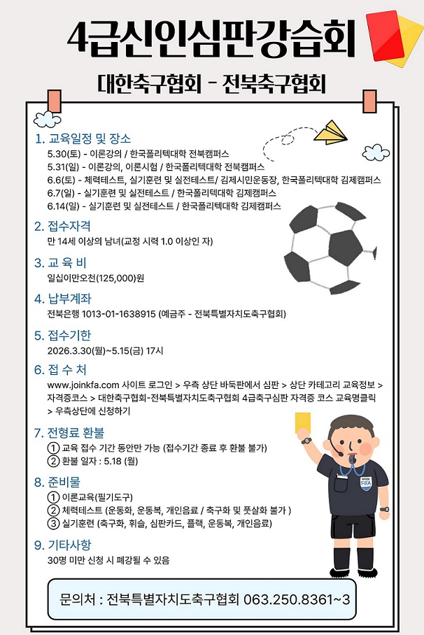 | 2026 KFA 5급 신입심판강습회 개최 알... | 2026.01.06 |